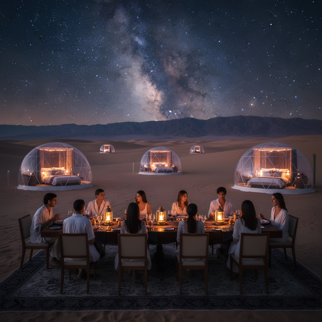 Au croisement du voyage et de l’art de vivre, Mirage Celestia propose des séjours d’exception de deux à trois jours dans des cadres naturels spectaculaires : Sahara, Wadi Rum, Atacama ou Oman. Le désert, écrin de pureté, offre un ciel préservé où la Voie lactée se dévoile dans toute sa splendeur. Chaque édition est éphémère et unique : un lieu, un chef étoilé, un artiste invité. Un petit groupe de dix à quinze voyageurs partage une expérience immersive entre nuit sous les étoiles, dîner gastronomique, atelier artistique et observation céleste depuis nos dômes résidentiels. Nos hôtels partenaires assurent un accueil raffiné avant cette parenthèse poétique, conçue pour reconnecter corps et esprit à l’essentiel.